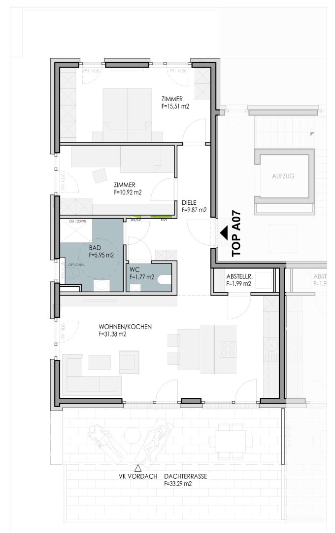 Die 3-Zimmer-Dachgeschosswohnung Top A07 erfreut ihre künftigen Bewohner durch eine ausgeklügelte Raumaufteilung: