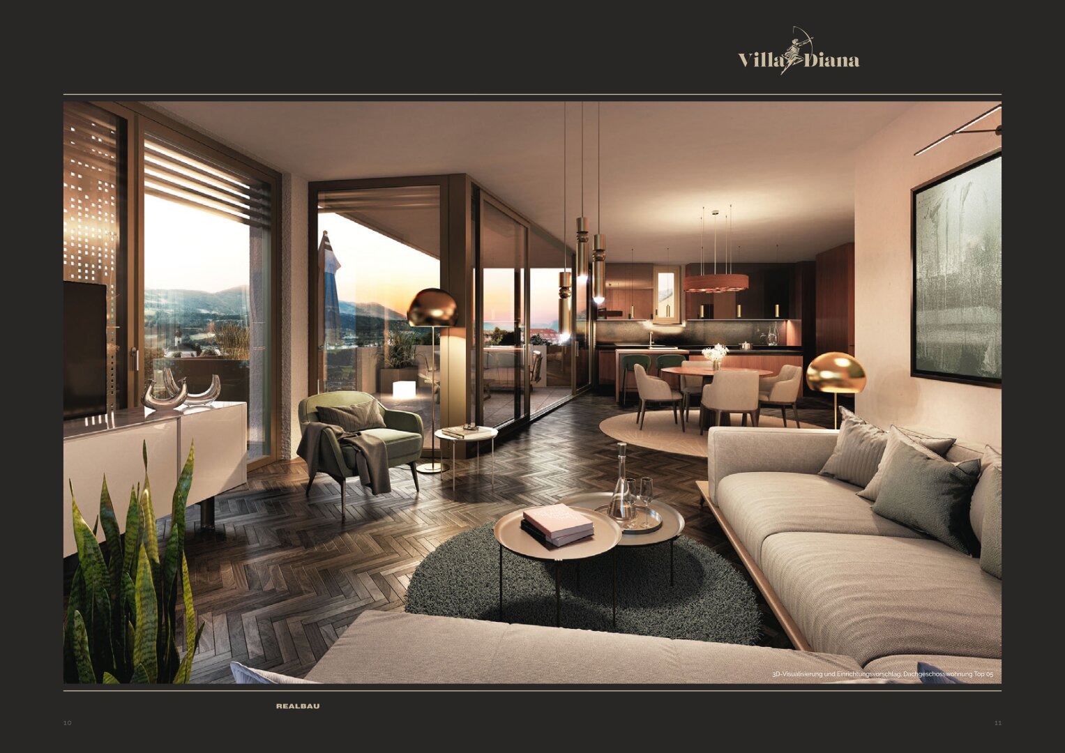 Offenheit und Eleganz verspürt man, wenn sich der Personenlift direkt in der Wohnung öffnet. Das durchdachte Raumkonzept ist umsichtig geplant. Die Küche mit Speis und der Essbereich bilden das Herz der Top 05 – das Wohnzimmer eine Nische der Geborgenheit.